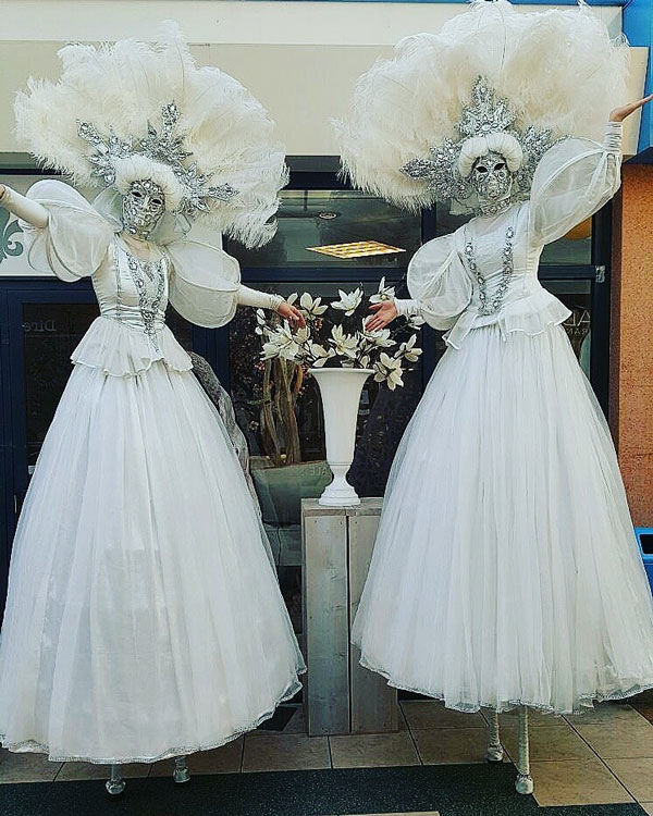 Con máscaras misteriosas de atractivo veneciano, estos zancudos helados brindan el entretenimiento itinerante perfecto para cualquier país de las maravillas invernal, espectáculo de hielo o evento temático veneciano.