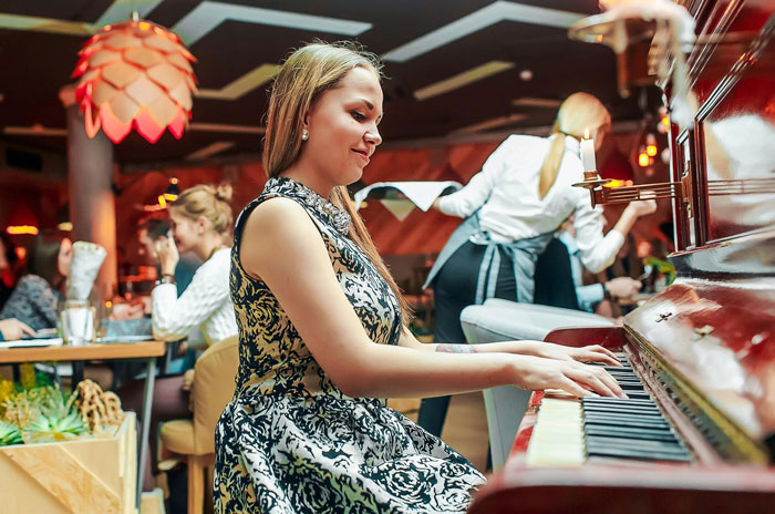 La cantante y pianista femenina tiene un asombroso repertorio de música que va desde canciones clásicas y románticas hasta música folclórica, jazz, pop y composiciones funky. Ella es capaz de adaptar completamente su estilo de interpretación para adaptarse mejor al cliente o al tipo de evento. Puede incorporar sutiles pistas de acompañamiento para hacer que su música en vivo sea más impactante o, alternativamente, nuestra Cantante y Pianista Femenina en Moscú puede ser contratada para tocar música de fondo completamente instrumental.