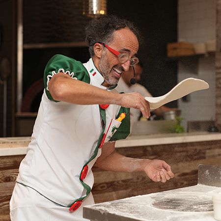Una forma única de hospitalidad, nuestro chef de pizza y freestyler combina un emocionante entretenimiento interactivo con comida deliciosa. Como chef profesional y animador, crea deliciosas y auténticas pizzas desde cero, al mismo tiempo que ofrece un divertido espectáculo que combina habilidades acrobáticas con la pizza y mucho humor. Tus invitados quedarán asombrados mientras él gira expertamente las bases de pizza en las puntas de sus dedos y las lanza al aire para atraparlas perfectamente.