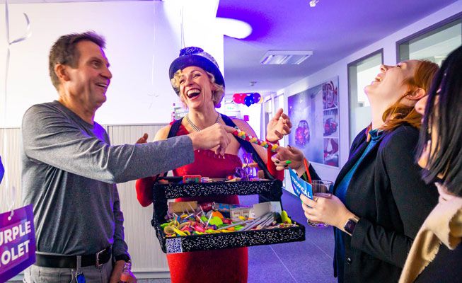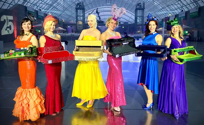Las bandejas se pueden llenar con dulces, aperitivos o regalos de marca, y el equipo ofrece más de 400 disfraces para combinar con eventos vintage, navideños o temáticos.