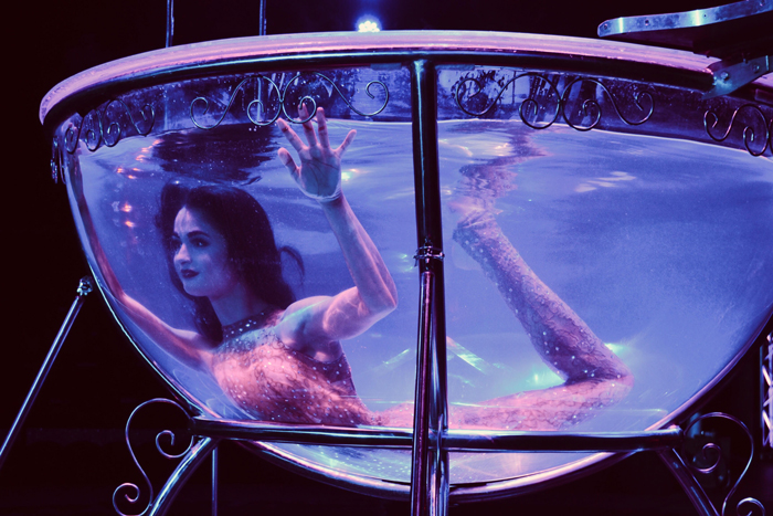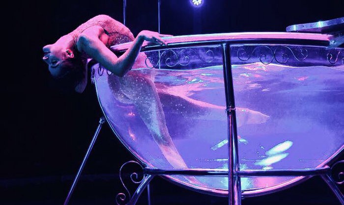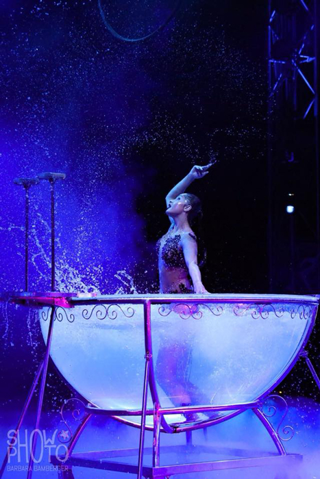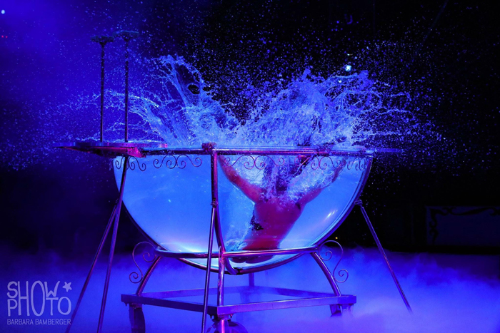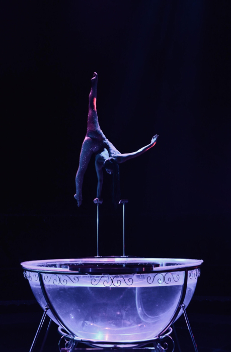 El intérprete puede incorporar un acto aéreo en el espectáculo del cuenco de agua para agregar un factor sorpresa adicional.
