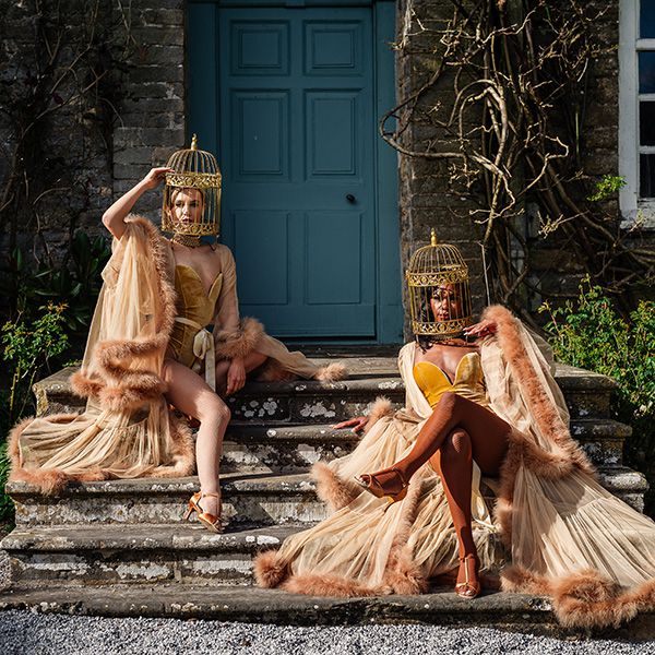 Llevan vestidos de tocador de exquisito diseño, adornados con elaboradas jaulas de pájaros, que desprenden un aura de glamour hollywoodiense de época