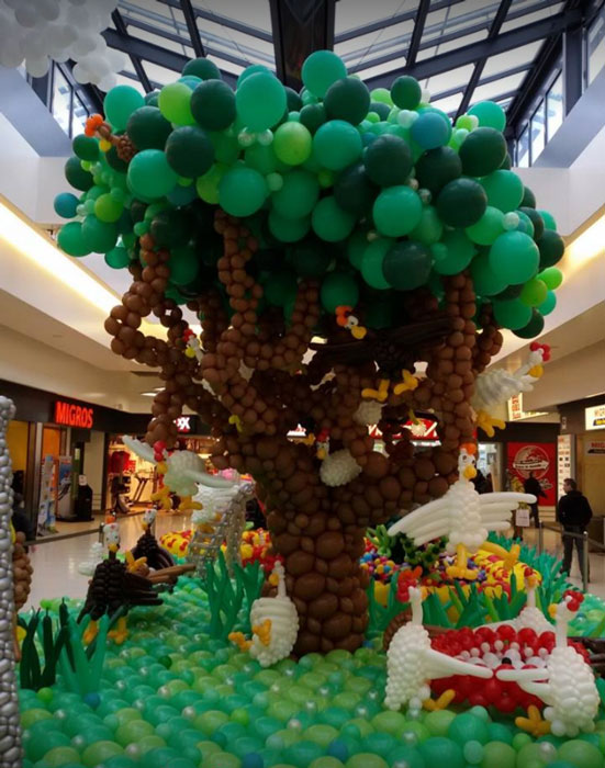Balloon Decor Switzerland es un proveedor innovador de instalaciones con globos que hasta ahora ha creado el escenario con globos más grande de Europa: una jungla misteriosa con más de 35,000 globos. También crearon el laberinto de globos más grande del mundo, compuesto por 100,000 galones en un área de 600m2. Las decoraciones temporales con globos requieren muy poco en términos de equipo y solo utilizan globos de látex 100% biodegradables para minimizar el impacto que sus desechos tienen en el medio ambiente.