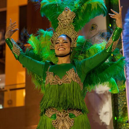 Esta parada de carnaval personalizada presenta hermosas showgirls de carnaval al estilo de Río, energéticos tamborileros marchantes y llamativos personajes animales!