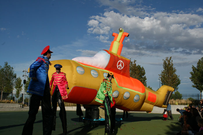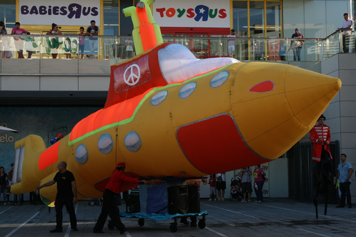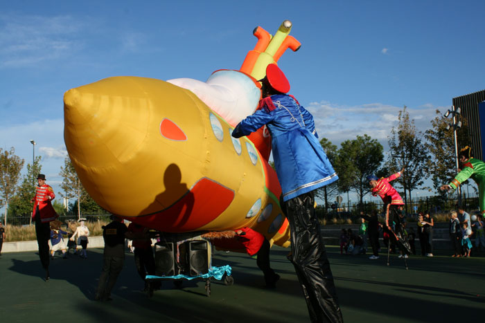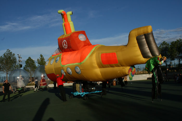 Los entusiastas zancudos temáticos no solo deambulan, sino que también pasan tiempo interactuando con los miembros del público y jugando con los niños. El llamativo Yellow Submarine inflable está fijado a una plataforma con ruedas y altavoces incorporados. A medida que pasa el Desfile de Yellow Submarine de los Beatles, suena música animada, que generalmente son versiones de Yellow Submarine de The Beatles.