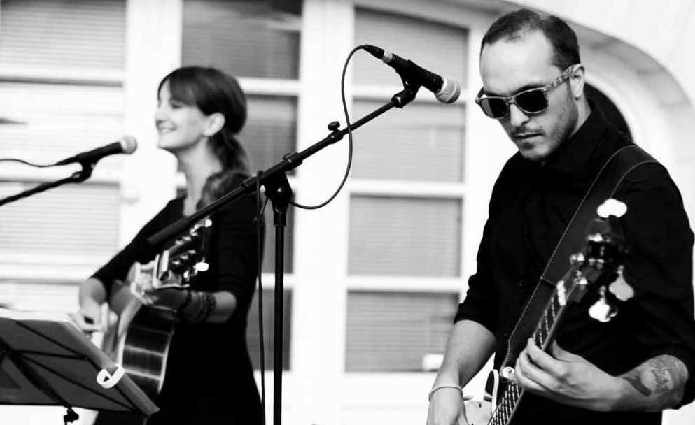Establezca el ambiente ideal con un dúo acústico en vivo, con voces masculinas y femeninas, ambos tocando la guitarra para crear una hermosa música de fondo.
