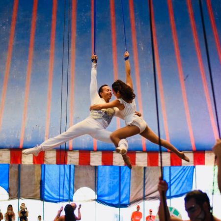 Estos artistas son multi-talentosos y se especializan en varios actos de circo, incluyendo aro aéreo, telas y correas, equilibrio de manos y zancos saltarines.