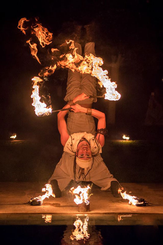 Este espectáculo de danza con fuego es una fusión visualmente impresionante de técnica impecable y creatividad ilimitada. Nuestros artistas del fuego se unieron para ofrecer una actuación verdaderamente fascinante que combina acrobacias con increíbles trucos de fuego. Utilizan una variedad de accesorios como abanicos de fuego y palos del diablo, así como pirotecnia para crear efectos deslumbrantes y coreografías de alta energía.