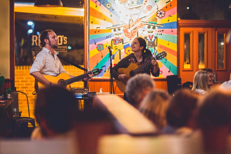 Actuando con una energía altamente contagiosa, nuestro dúo de guitarra Rumba emociona al público con sus impresionantes composiciones originales de música instrumental de guitarra flamenca.