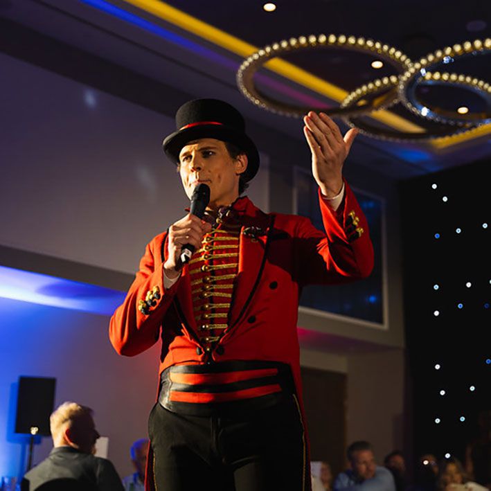Con una presencia impactante en el escenario, nuestro maestro de ceremonias reúne a los artistas de circo y bailarines, a través de narrativa y canciones, para un espectáculo épico.
