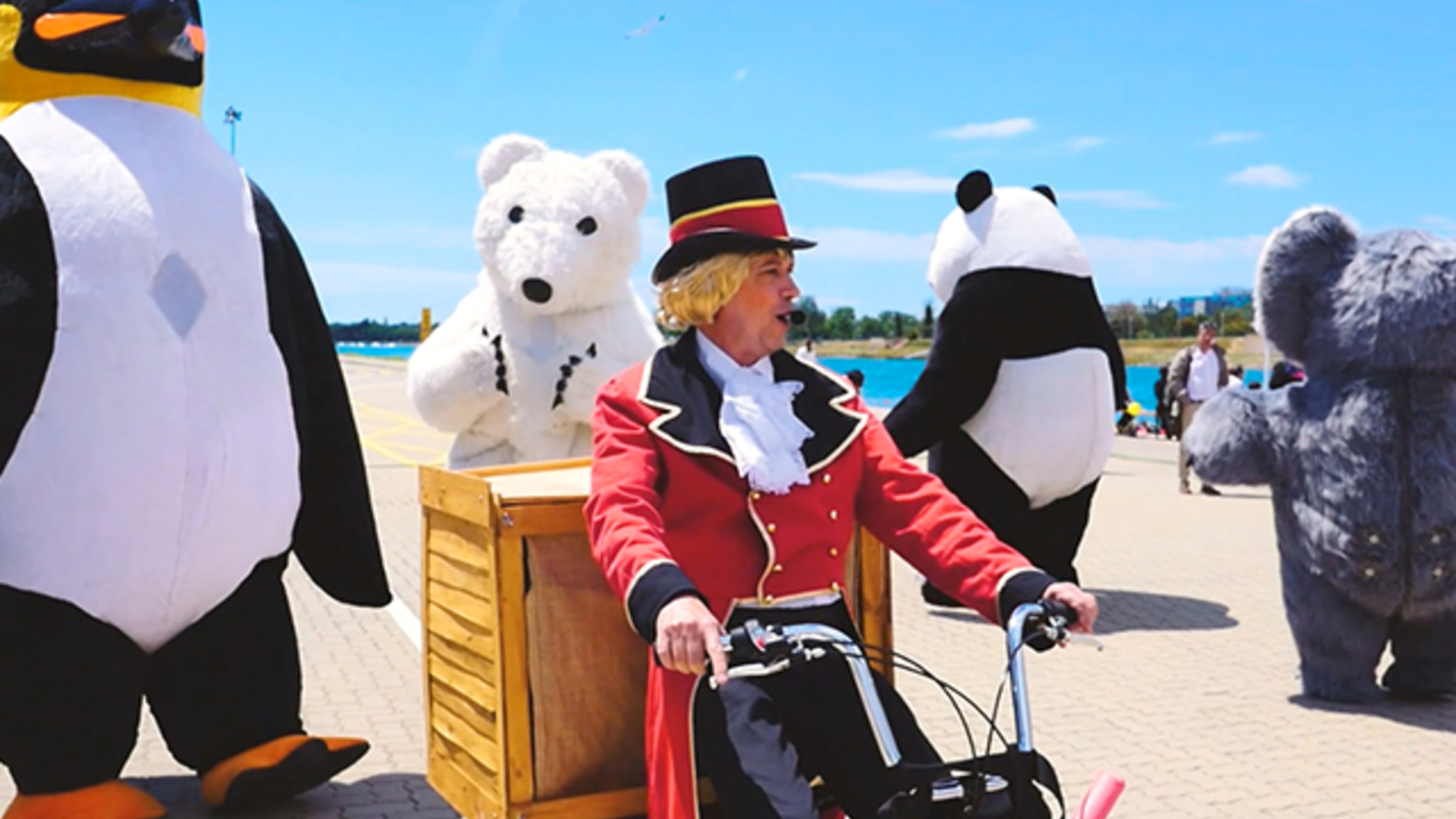 Vestido como un maestro de ceremonias y conduciendo su triciclo, este encantador de animales guía a los animales en tu evento.