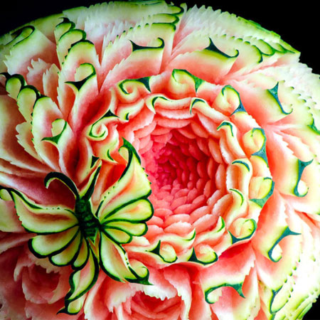 Después de trabajar como chef de repostería en un restaurante de gran prestigio en Sicilia, nuestro tallador de alimentos descubrió su talento para hacer delicadas esculturas de frutas y verduras. Curioso por esta forma de arte, nuestro artista culinario perfeccionó sus habilidades estudiando técnicas utilizadas en el arte tailandés.