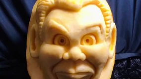 Su excepcional atención al detalle convierte las calabazas ordinarias en rostros realistas, personajes de películas o piezas promocionales con logotipos y branding.