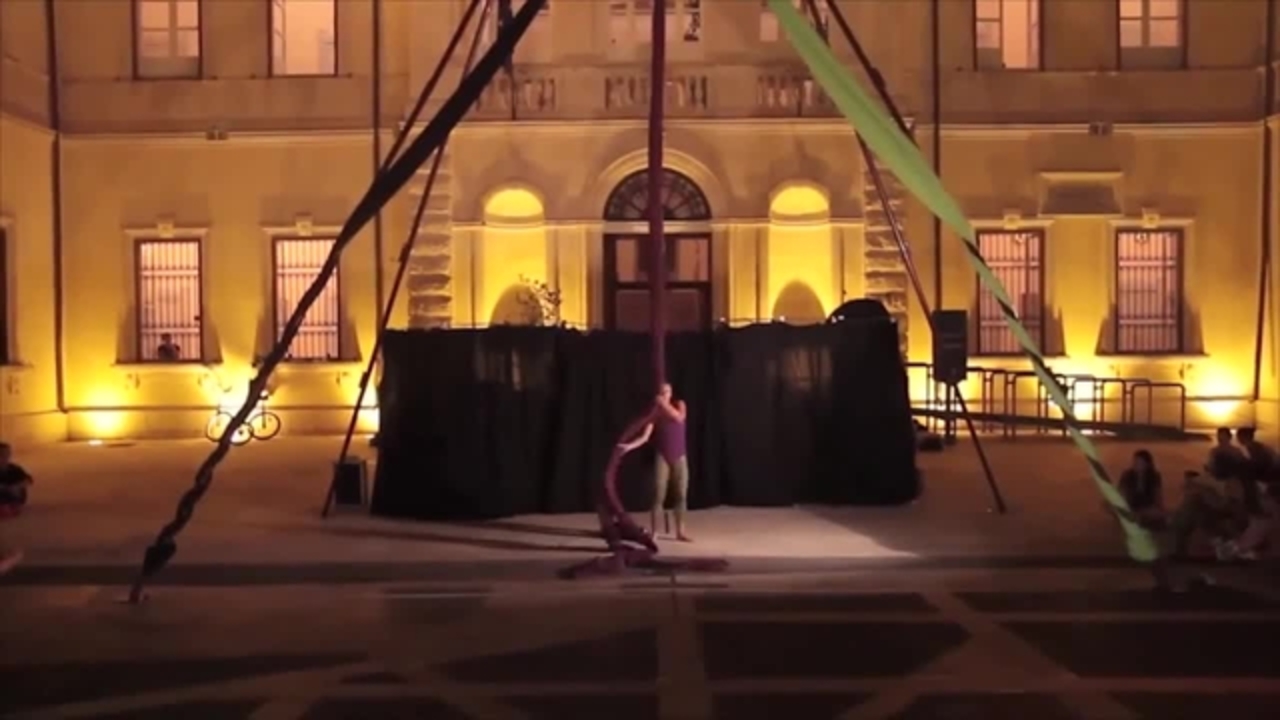 Compuesto por telas aéreas, lyra, un dúo de trapecio estático y aros aéreos, los artistas se especializan en crear producciones nuevas y originales para eventos especiales.