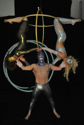 Tres artistas aéreos realizan una actuación técnicamente difícil suspendidos en el aire en dos aros entrelazados.