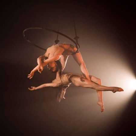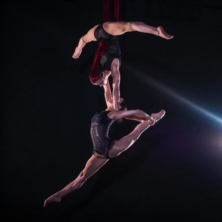 Sus actuaciones en aro aéreo y telas demuestran una fuerza notable y una gracia impactante, y se pueden reservar como una actuación en solitario o en dúo.