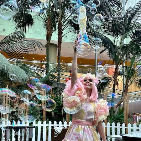 Esta talentosa artista de burbujas ofrece entretenimiento interactivo para niños que toda la familia puede disfrutar