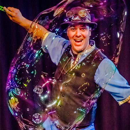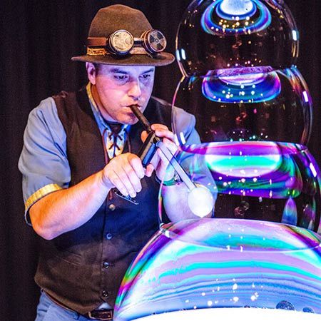 Especializado en burbujas de jabón, este acto versátil puede tener lugar tanto en interiores como en exteriores, además de ofrecer talleres de arte con burbujas, que son una excelente opción de entretenimiento después del espectáculo. Los asistentes podrán esperar estar dentro de una burbuja gigante y disfrutar de burbujas saltarinas, burbujas cuadradas, burbujas dentro de burbujas, burbujas de humo y burbujas de fuego. ¡Una actuación extremadamente divertida y dinámica con una combinación perfecta de narración, arte con burbujas y magia!