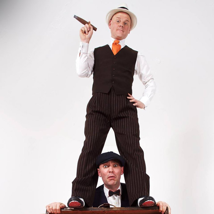 Nuestro espectáculo de comedia de gangsters de los años 1920 es un clásico acto de comedia doble con malabares, rolla bolla y varias travesuras cómicas. Botellas y vasos de vidrio reales, así como maletas vintage, vuelan por el escenario en medio de un torbellino de claqué y saxofón en vivo en un acto de comedia silenciosa de estilo cabaret completo. Nunca hay un momento aburrido y tus invitados se quedarán con una gran sonrisa en sus caras.