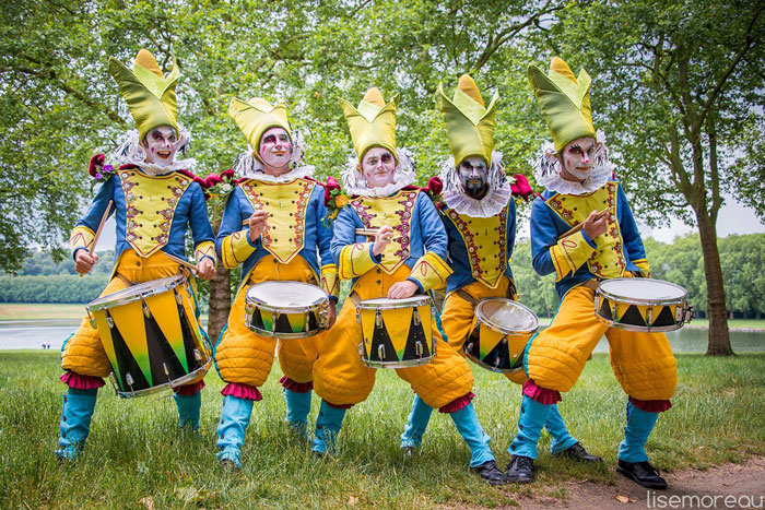 La actuación comienza a nivel del suelo con un prolongado desfile de tamborileo. Siete bufones vestidos de forma llamativa, cuyos trajes se asemejan a una pandilla de arlequines de un cuento infantil, se abren paso entre la multitud. Realizan ritmos marchosos y animados con cánticos y silbatos. A medida que el desfile de tamborileo avanza entre el público, interactúan con los miembros del público e intentan involucrarlos en la actuación.