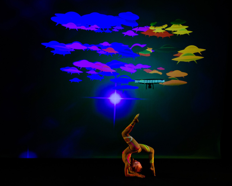Este espectáculo visualmente impresionante comienza con una rutina en el suelo realizada por nuestra talentosa contorsionista femenina, quien presentará a la audiencia un mundo colorido de platillos voladores. Nuestra acróbata aérea descenderá graciosamente desde el techo llevando consigo un dron LED. Después de soltarlo, realizará una impresionante danza en aro aéreo que, combinada con los impresionantes gráficos mostrados detrás de ella, convertirá esta actuación en un festín visual para los ojos.