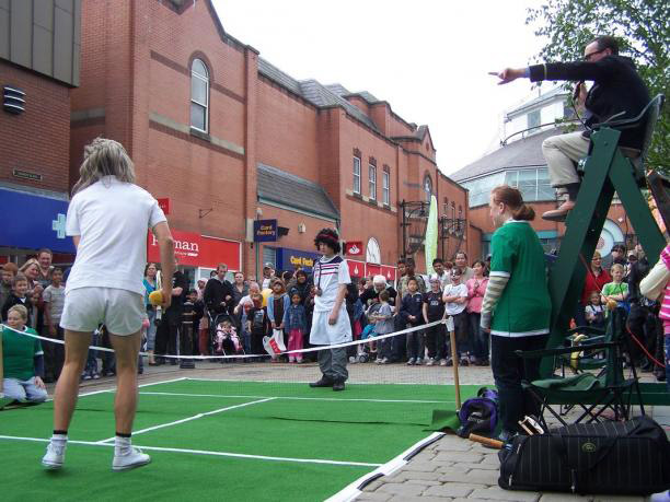 Nuestros artistas callejeros fomentan mucha participación del público y los valientes espectadores ocuparán el papel de recogepelotas, fisioterapeuta e incluso presentador de premios reales en nuestro fabuloso entretenimiento de tenis. Este acto de tenis es ideal para festivales al aire libre, actuaciones callejeras y eventos deportivos de todo tipo, y nunca dejará de atraer a una gran multitud.