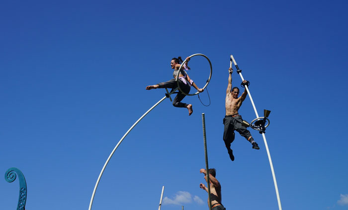 Con sede en Australia, el increíble Show Acrobático Temático del Mar utiliza un barco grande como pieza central de su actuación. Los acróbatas se balancean y se deslizan alrededor de grandes postes oscilantes disfrazados como mástiles de navegación y remeros mientras ofrecen una actuación teatral narrativa. Los acróbatas se balancean en los postes al ritmo de los movimientos del mar o el viento.
