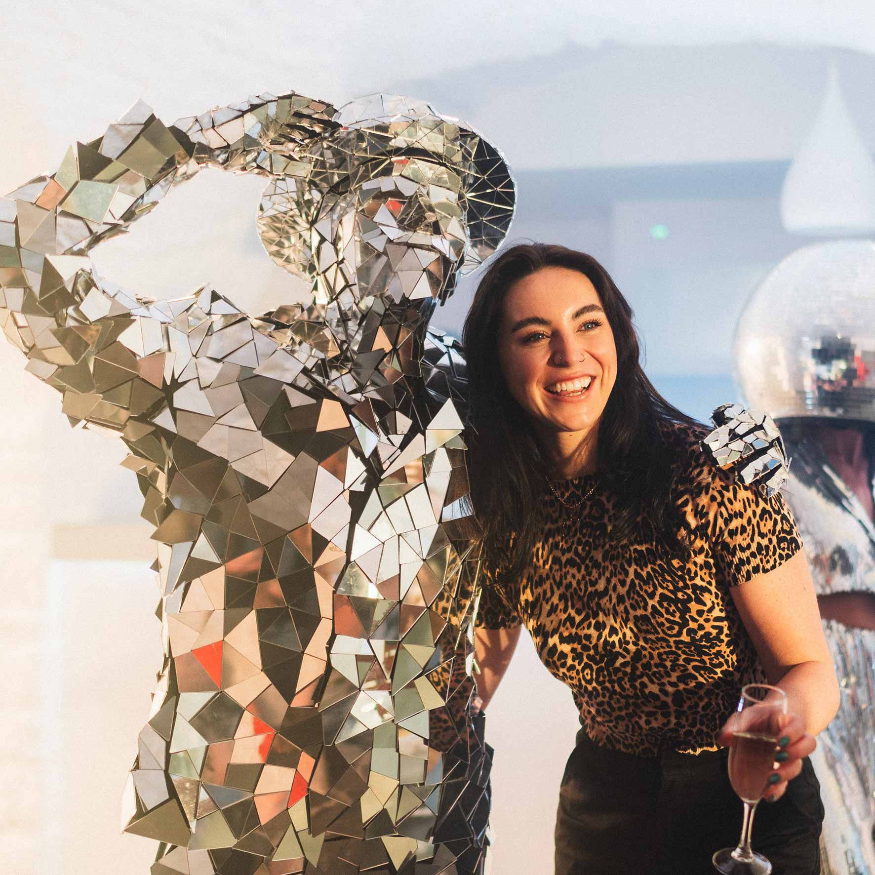 Nuestro equipo ofrece una emocionante experiencia inmersiva con increíbles trajes inspirados en la música disco donde los invitados podrán aprovechar para hacerse fotos e interactuar con nuestros personajes de los años 70, incluidos hombres espejo, bailarines ambientales, zancudos y un elegante vestido de champán.