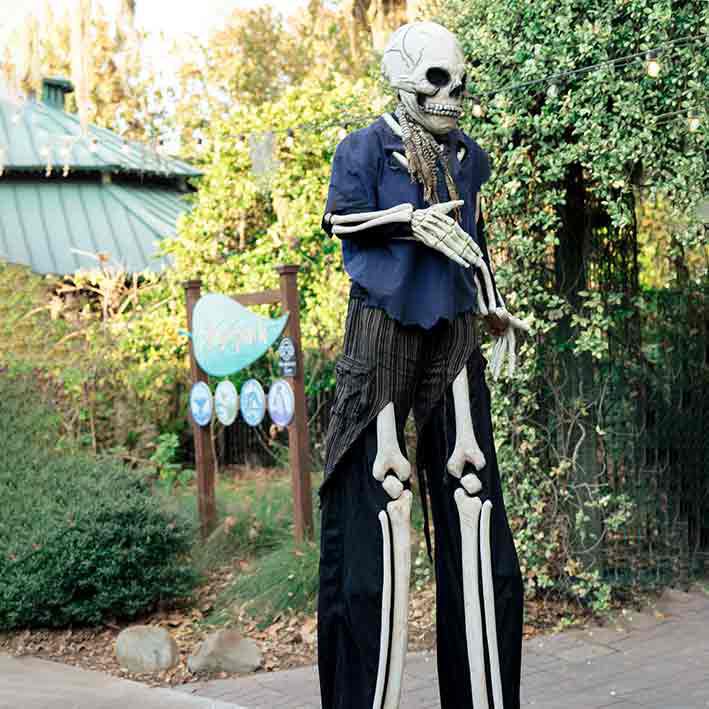 Elevándose sobre los invitados a una altura impresionante, este travieso esqueleto interactuará con todos los que se crucen en su camino, chocando los puños, posando para las fotos y mostrando sus espeluznantes movimientos de baile.