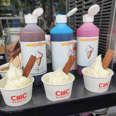 Los invitados pueden elegir entre helado cremoso servido en un cono o tarrina y elegir un topping de una selección de virutas, salsas, frutos secos y malvaviscos.