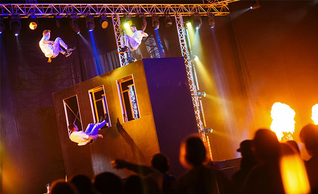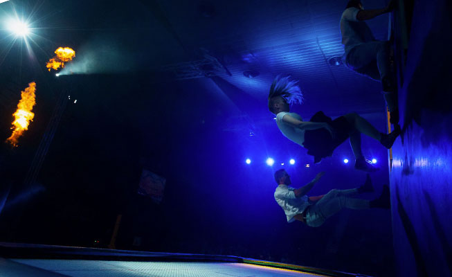 Dos trampolines de tamaño olímpico permiten que hasta 6 artistas actúen simultáneamente, creando un espectáculo espectacular.