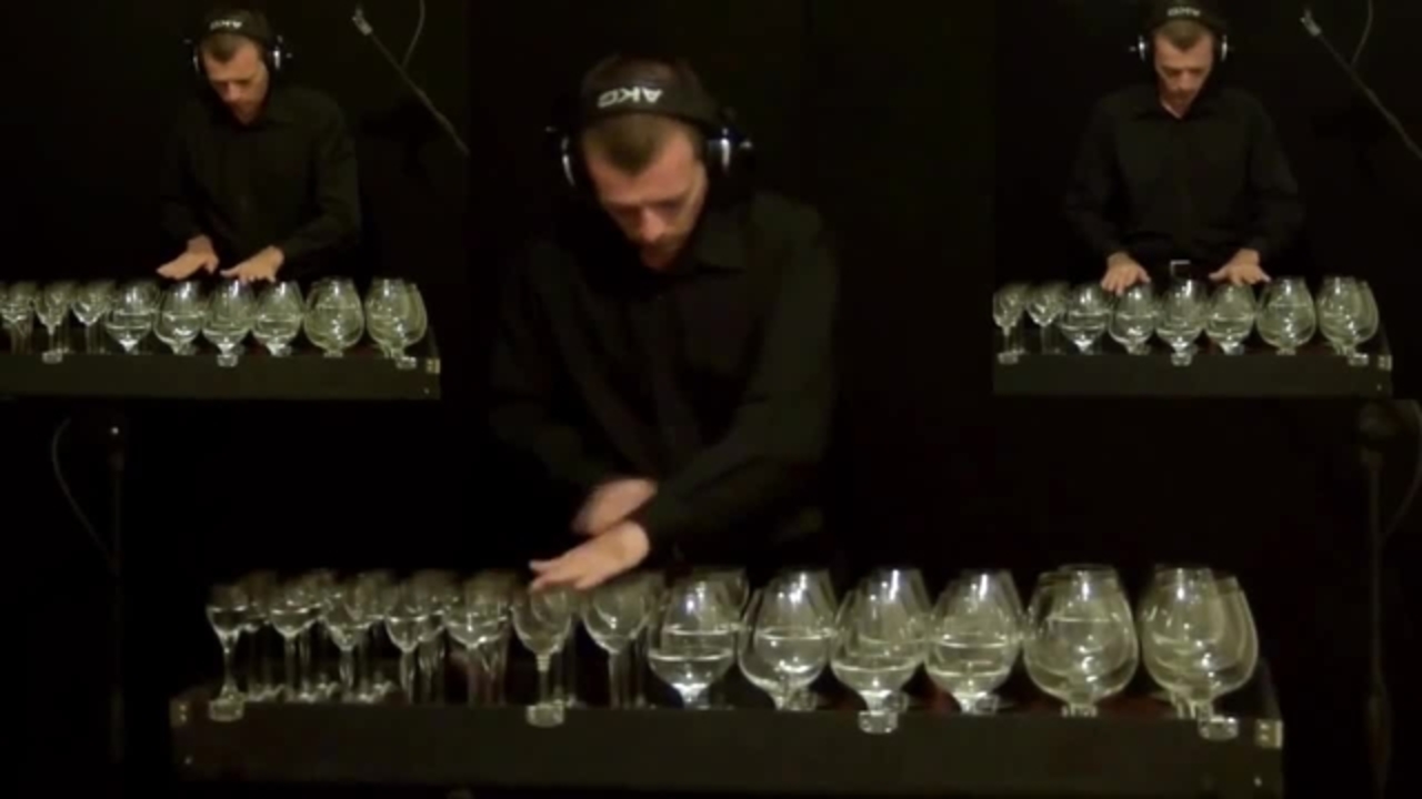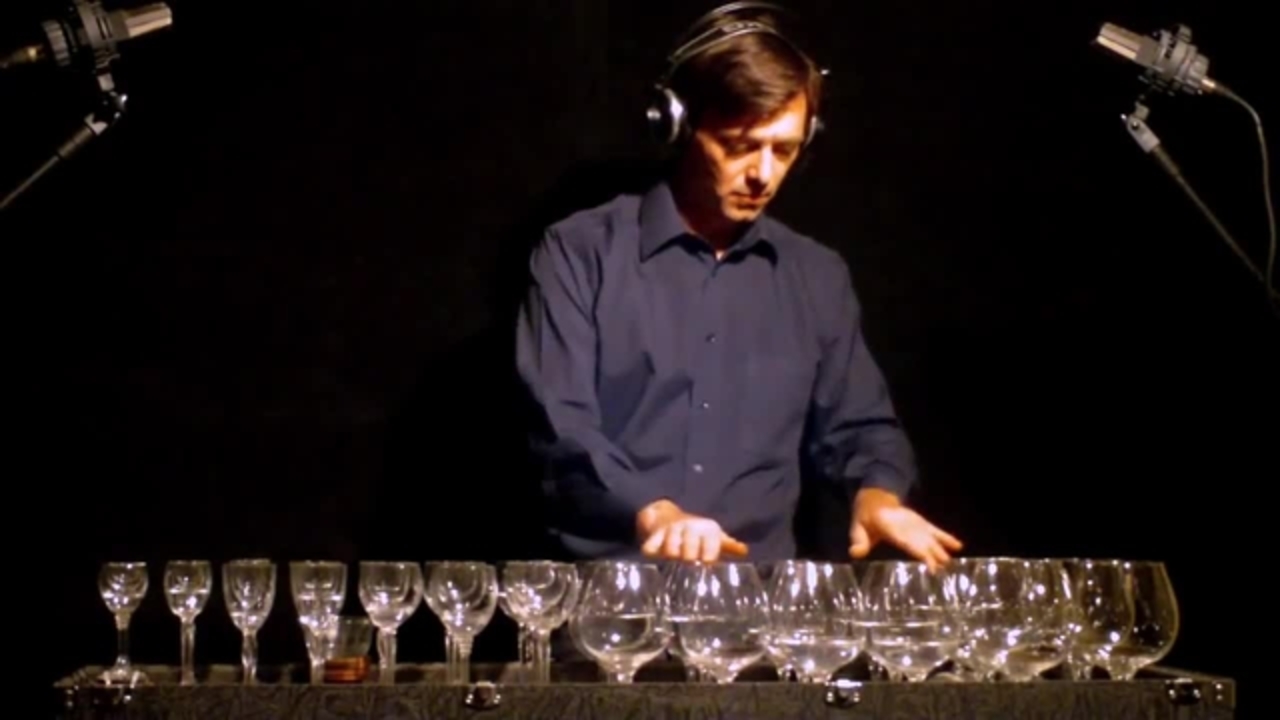 Transformando un conjunto de copas de vino con tallo en un instrumento musical mágico, Robert ajusta cuidadosamente cada copa agregando una cantidad precisa de agua. Luego, usando solo las puntas de sus dedos, se mueve expertamente de una copa a otra produciendo diferentes sonidos.