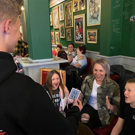 Nuestro joven mago del Reino Unido interactúa con los invitados y los sumerge en el misterio y la maravilla, utilizando juegos de manos para hacer que lo imposible parezca posible.