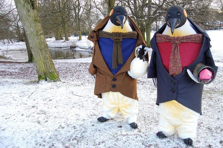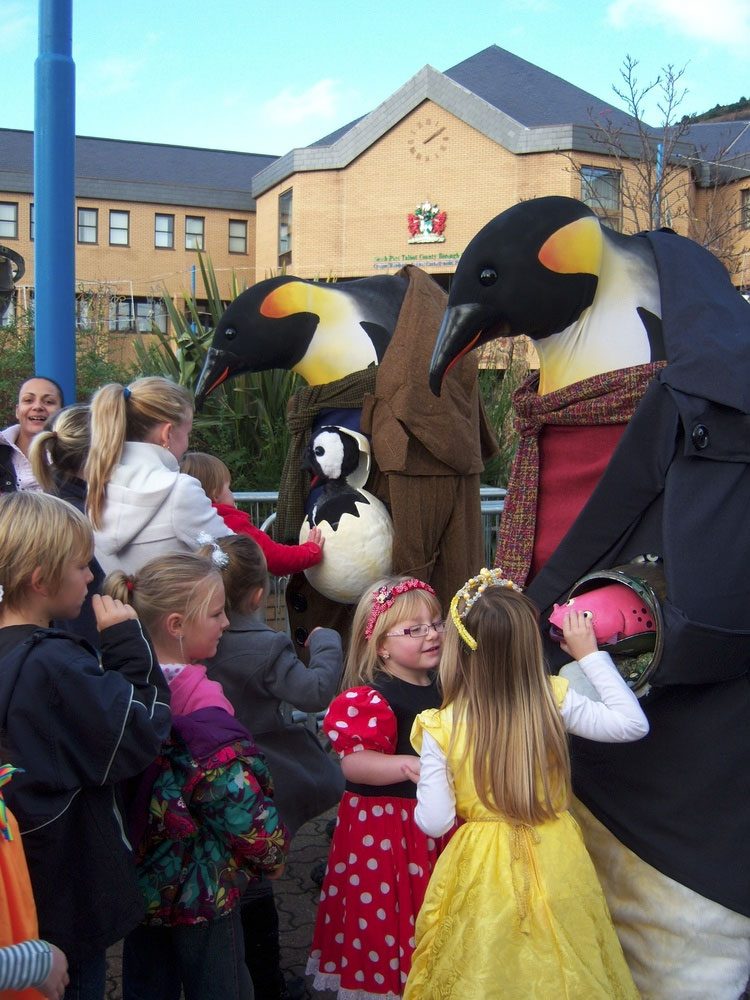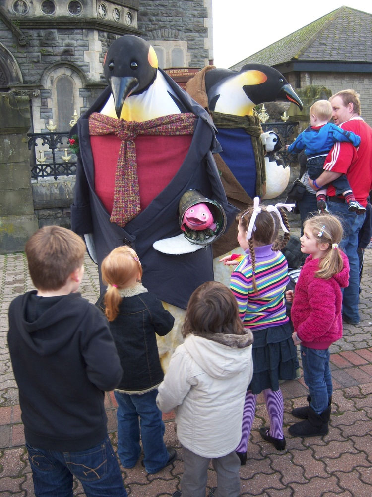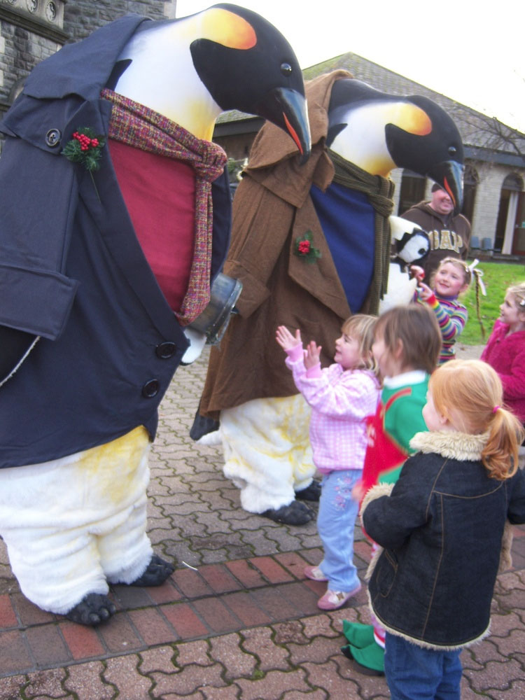 Disponible como dos pingüinos adultos, dos pingüinos adultos más su bebé, o la familia completa con Urving Mackerel Esq. - ¡son tres actos por el precio de uno! Combinando disfraces animatrónicos, títeres tradicionales, una fuerte caracterización y diálogos ingeniosos, estos gigantes gentiles y sus traviesos cargos seguramente encantarán en cualquier evento temático de Navidad, Invierno o Medio Ambiente.