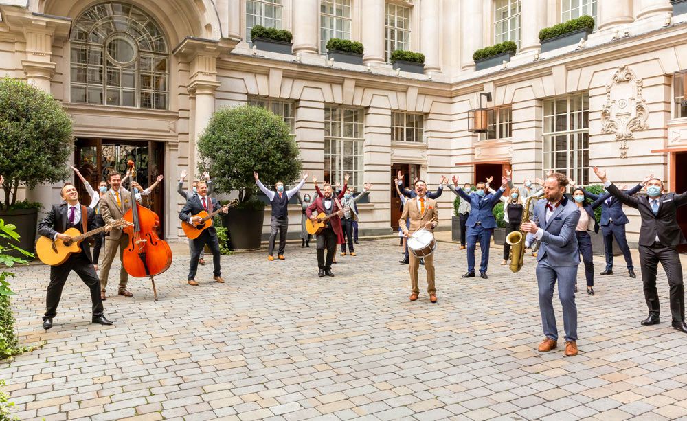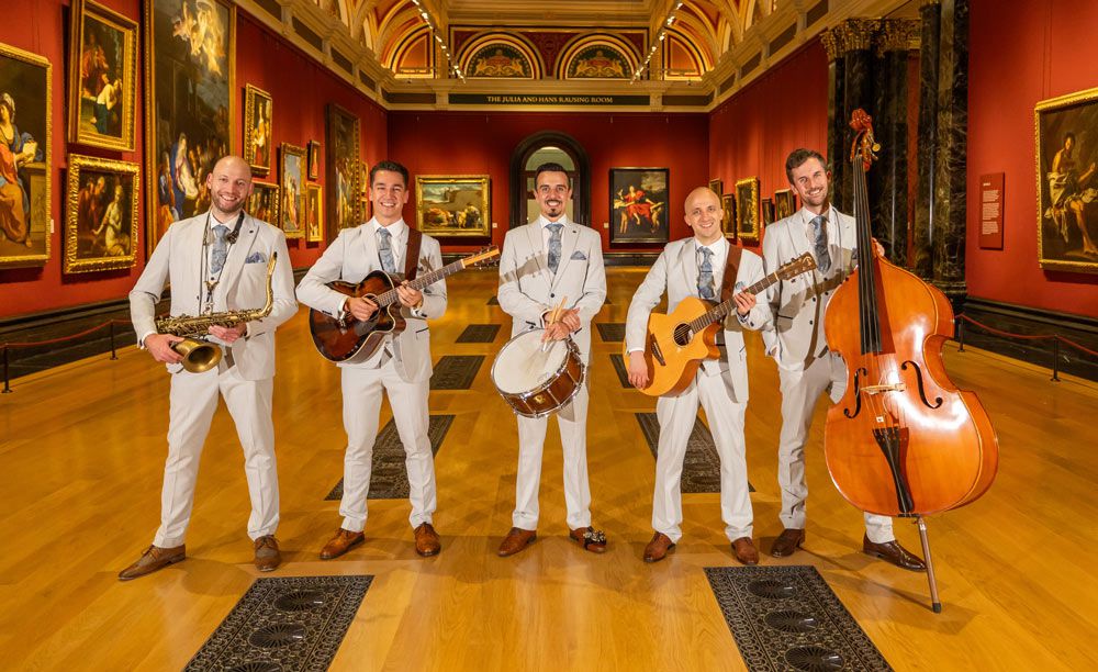 Paseándose por su evento y actuando en diferentes mesas o grupos de invitados, nuestra banda itinerante de Londres interactúa con todos los que encuentran y tocan su increíble música desde cualquier lugar de su lugar, además de ofrecer la opción de ser contratados como una banda fija en un lugar con un sistema de sonido. Vestidos para impresionar, nuestra banda itinerante de bodas cuenta con el patrocinio del galardonado diseñador británico Marc Darcy, asegurando que luzcan como caballeros ingleses dondequiera que vayan.