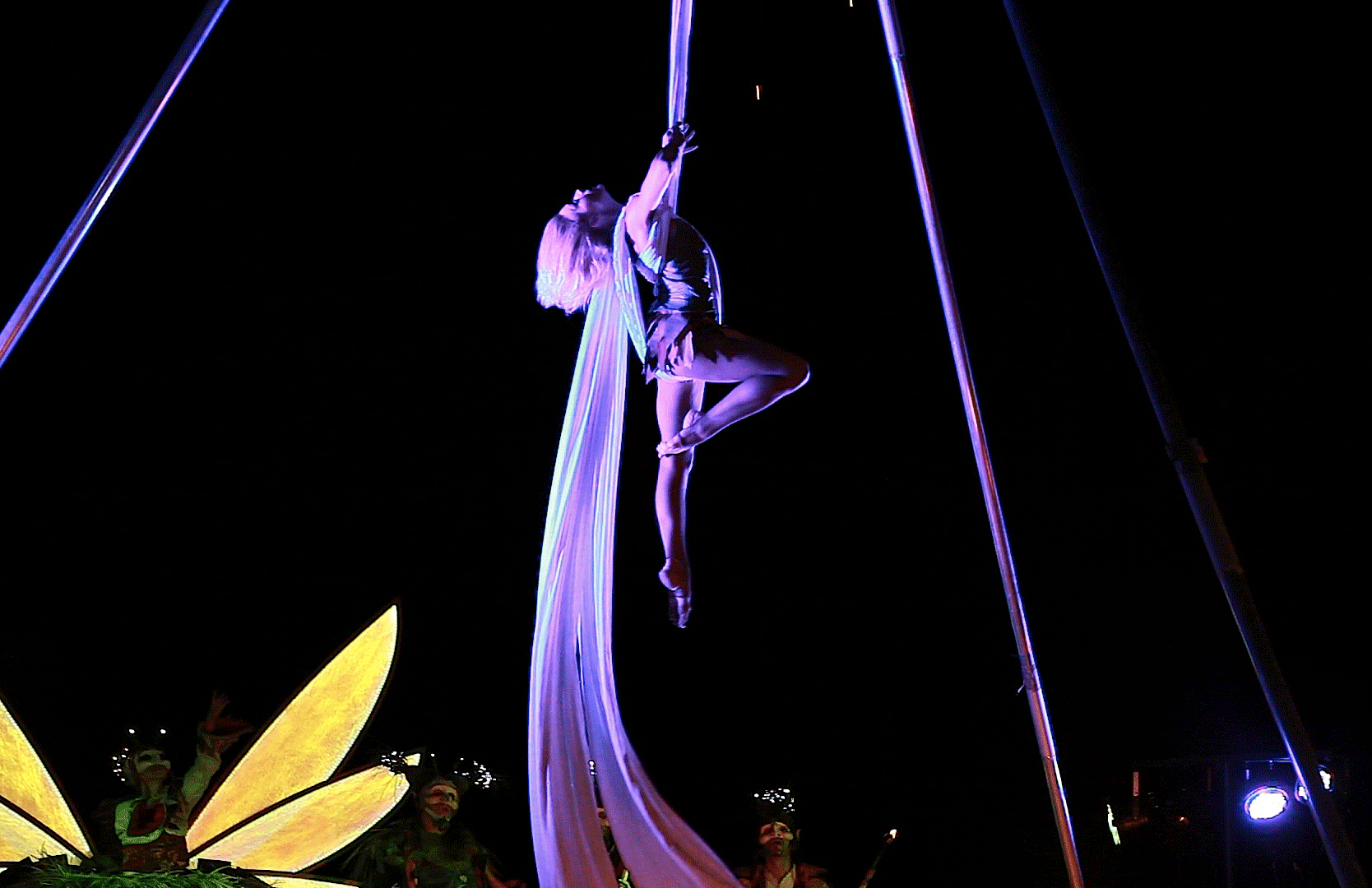 Este extraordinario acto callejero cuenta la historia de 'Las Personitas'; seres alados que viven debajo de las flores en nuestro jardín. Viajan por el mundo guiados por su alquimista, quien lee las estrellas y las semillas de las manzanas para encontrar el camino.