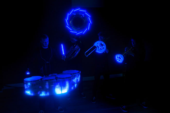 Los tambores y metales LED utilizan una increíble tecnología LED pionera para crear un espectáculo audiovisual fascinante tanto para ver como para escuchar. Equipados con palos de luz, paneles y tiras LED, los músicos LED han creado complejos espectáculos de luces que están sincronizados tanto entre los instrumentos y una pista de audio como entre ellos mismos. Coreografían rutinas de alto calibre con una batería rudimentaria altamente visual y trucos con las baquetas. Sus espectáculos de luces únicos son totalmente personalizables y pueden mostrar texto o logotipos en los tambores e incluir logotipos impresos en los bombos iluminados.