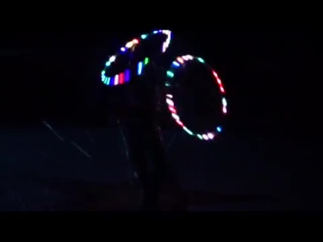 Acto hipnótico de LED realizado por un talentoso bailarín con varios aros de hula iluminados.