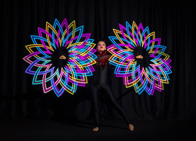 Las formas y colores dramáticos que nuestros giradores de poi crean sorprenderán y cautivarán a las audiencias en cualquier actuación, fiesta o evento. Disponibles para una variedad de actuaciones que van desde 5 a 25 minutos e incorporan la gama completa de giradores de poi, hula hoops LED y narración visual.