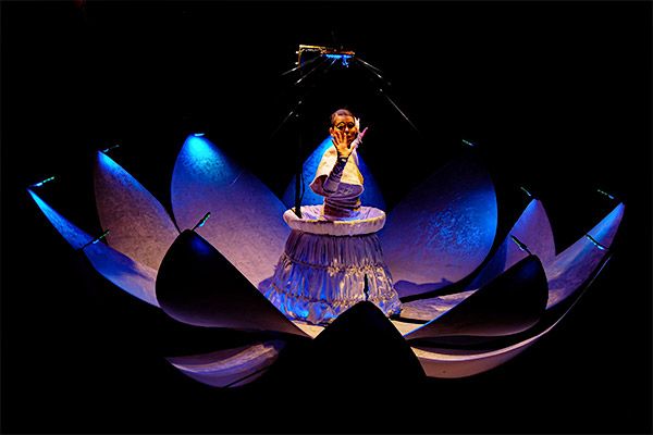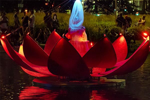 Observa maravillado cómo tres gigantes nenúfares flotantes de LED se abren para revelar elegantes bailarines en este espectáculo fascinante de estilo de cuento de hadas.