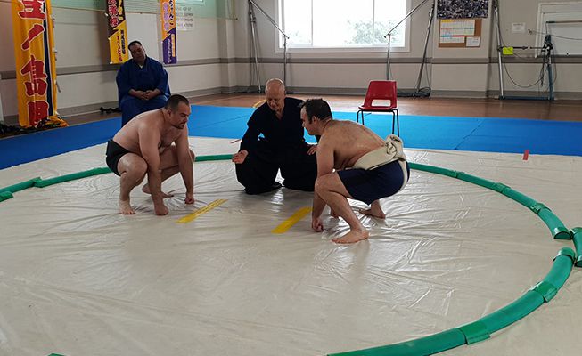 Vistiendo trajes tradicionalmente inspirados, demuestran movimientos auténticos de lucha de sumo para los invitados.