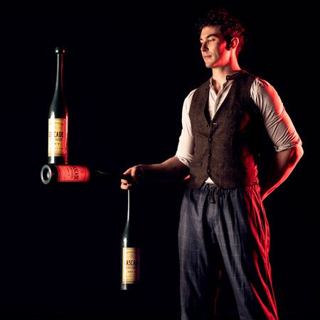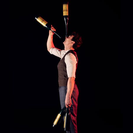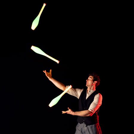 Hace malabares con una amplia selección de objetos, como botellas de champán, bolas LED, porras de fuego, cajas de puros y nunchakus de píxeles LED