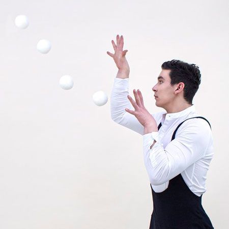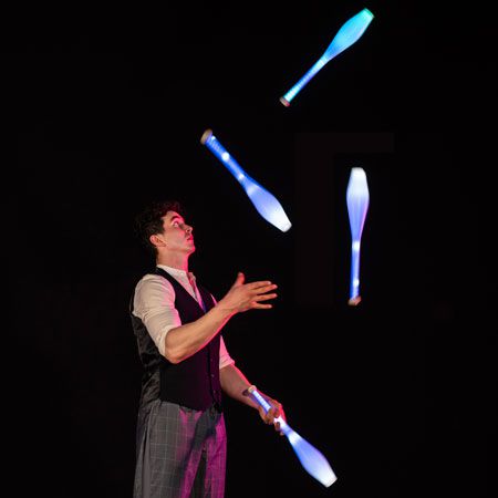 Este experto artista de circo combina una serie de técnicas de malabares con números acrobáticos para crear un espectáculo de malabares acrobáticos único y dinámico