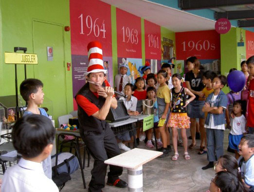 Además de sus espectáculos itinerantes y actuaciones en escenarios estáticos, Jimmy también utiliza creativamente sus habilidades de malabarismo para demostrar conceptos como la seguridad vial, la gestión de calidad y la gestión de riesgos, lo que lo convierte en la elección perfecta para espectáculos educativos y talleres corporativos. Su licenciatura en Ingeniería (B.Eng) de la Universidad Tecnológica de Nanyang es especialmente útil para clientes que necesitan comunicar conceptos complejos de manera clara a una audiencia.