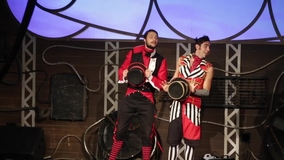 Luciendo trajes victorianos actualizados tomados del estilo tradicional de entretenimiento circense del "gran carpa", este dúo divertido se ve completamente adecuado. Solo se requiere un área de escenario o espacio abierto (¡y sin viento!) para que la pareja cuente una historia humorística utilizando una colección de sombreros. Comenzando con los dos saludándose inclinando sus sombreros, luego proceden a realizar todo tipo de trucos desconcertantes.