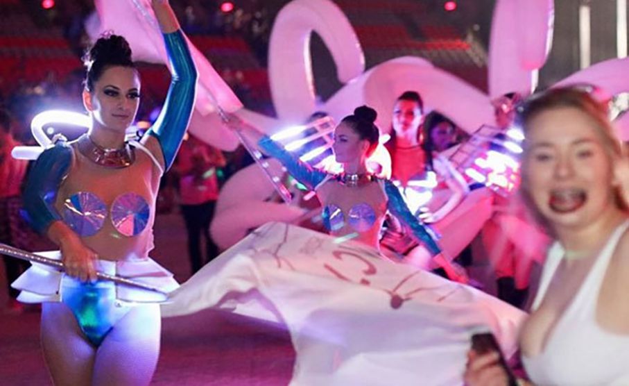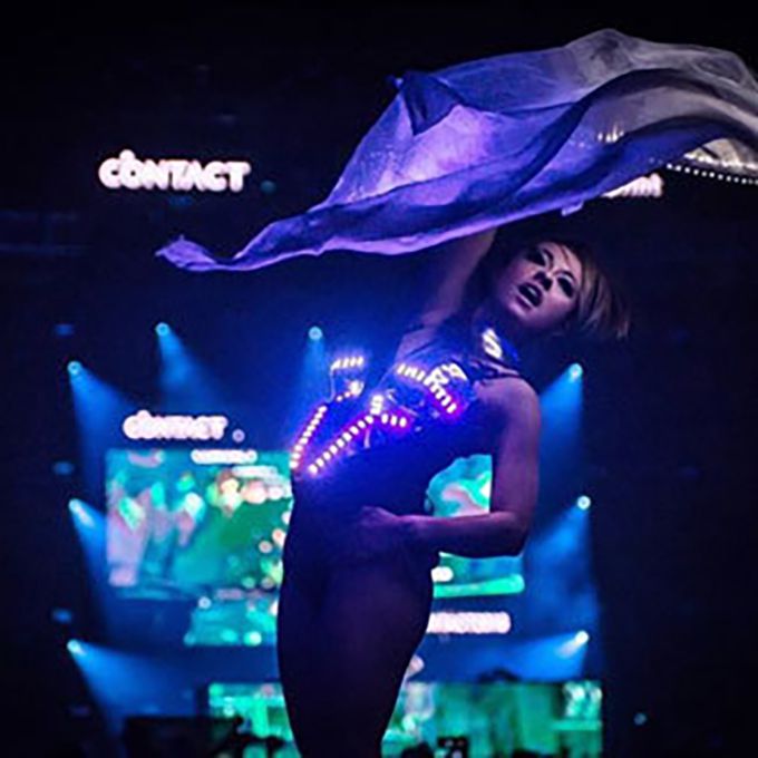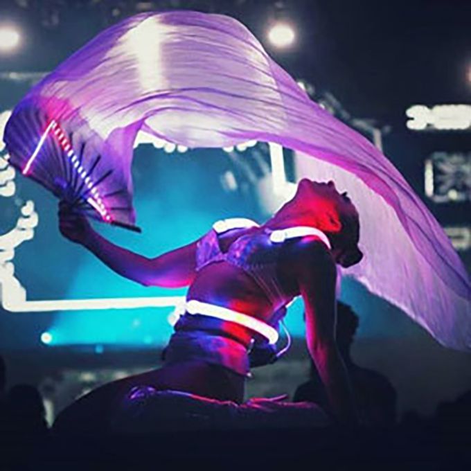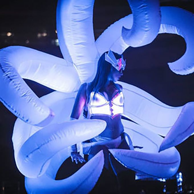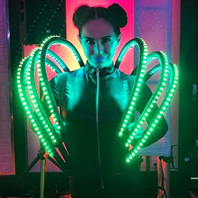 Los trajes iluminados van desde alas de ángel y abanicos LED hasta velos y máscaras innovadoras de lámparas.