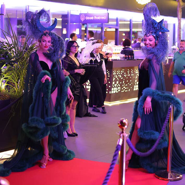 Scarlett Dolls recibirá y saludará a sus invitados a su llegada con trajes que incluyen nuestro Vestido de Champán, Esfera de Burbujas o Lámparas Vivientes.