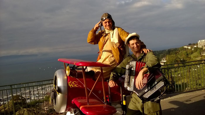 Nuestra divertida rutina de los pilotos franceses itinerantes vintage involucra un toque de poesía de fantasía y la interacción con las multitudes. Reparten postales en blanco y animan a los espectadores a completarlas y enviarlas de vuelta en el buzón adjunto al avión. Como fantásticos músicos ambulantes, el dúo ofrece también música en vivo interesante. Tocando el acordeón y el violín, el par de músicos ambulantes interpreta una selección de versiones peculiares en un estilo antiguo. Puedes esperar escuchar canciones como Space Oddity de David Bowie, Message In A Bottle de The Police y Call Me The Breeze de J.J. Cale.