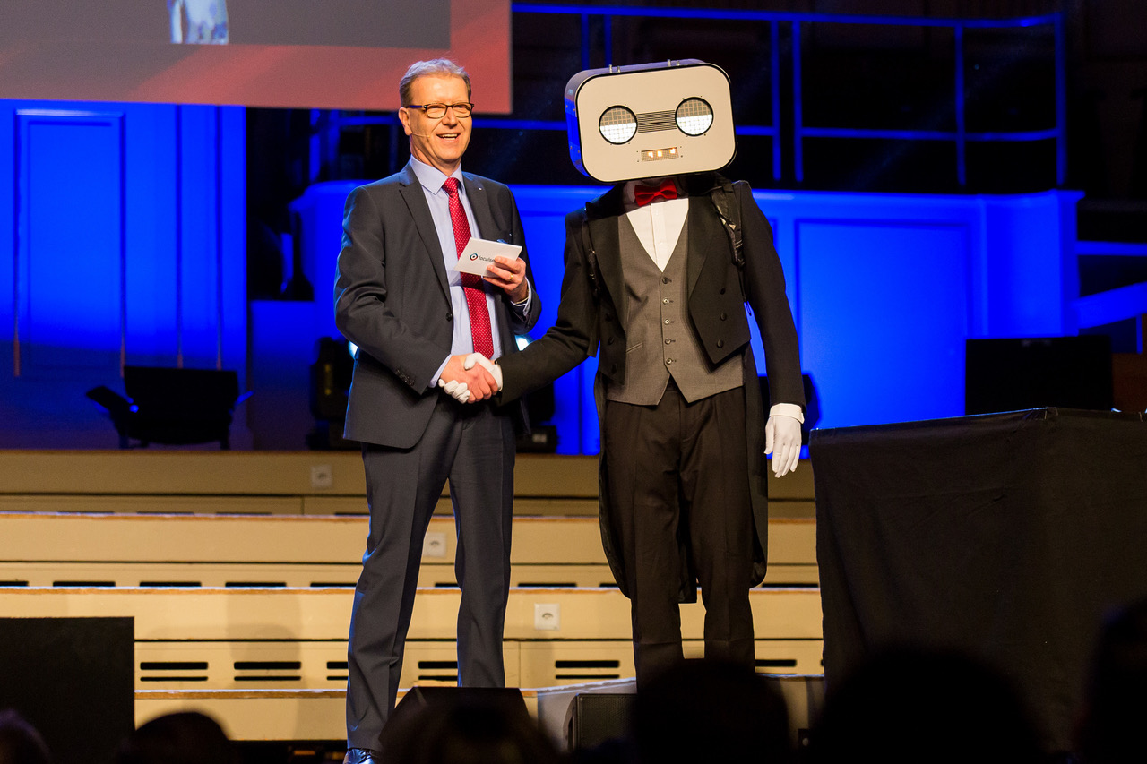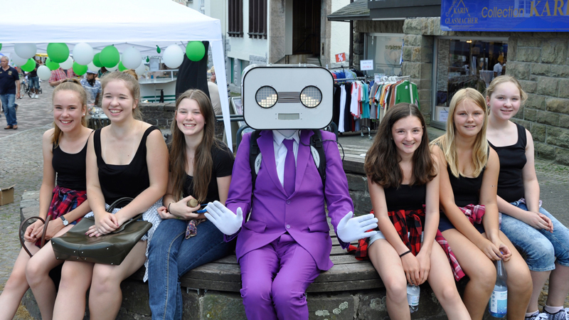 A los niños les encantan, las damas lo adoran y los hombres siempre entablan conversación con él sobre la informática vintage: ¡todos se reúnen alrededor de nuestro robot promocional para tomarse un selfie!