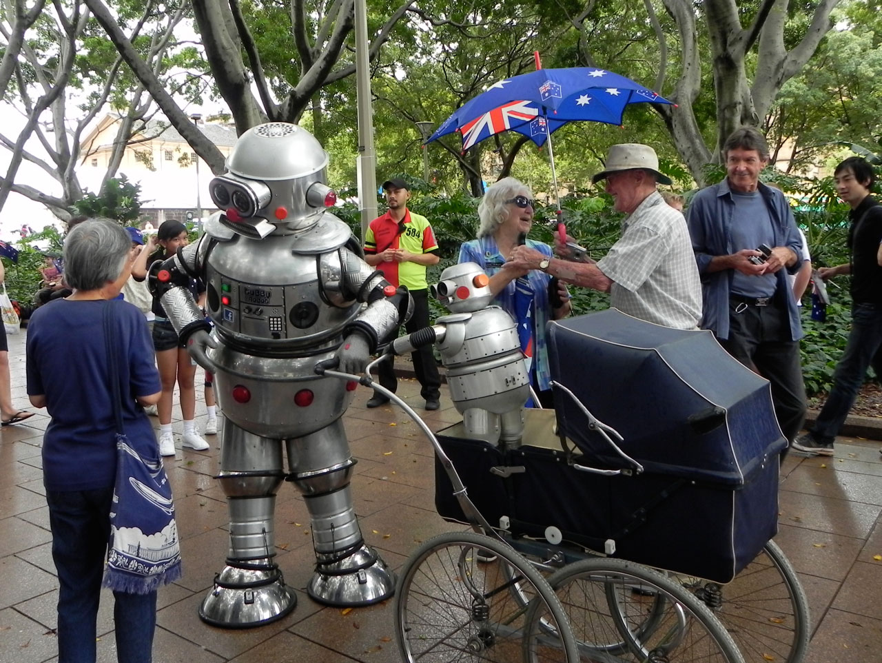Un favorito de la familia, el robot y el bebé son un acto tierno que representa la relación entre padre e hijo de manera juguetona y humorística.